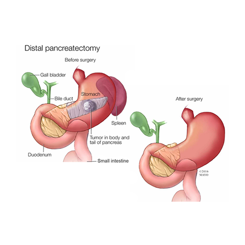 A distal pancreatectomy is performed to treat pancreatic cancers of the tail or body of the pancreas. Pancreatic cancer can occur in any part of the pancreas and can spread to nearby lymph nodes (part of the immune system) or nearby organs such as the stomach or colon.